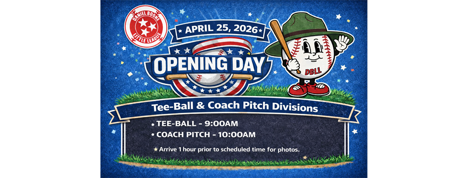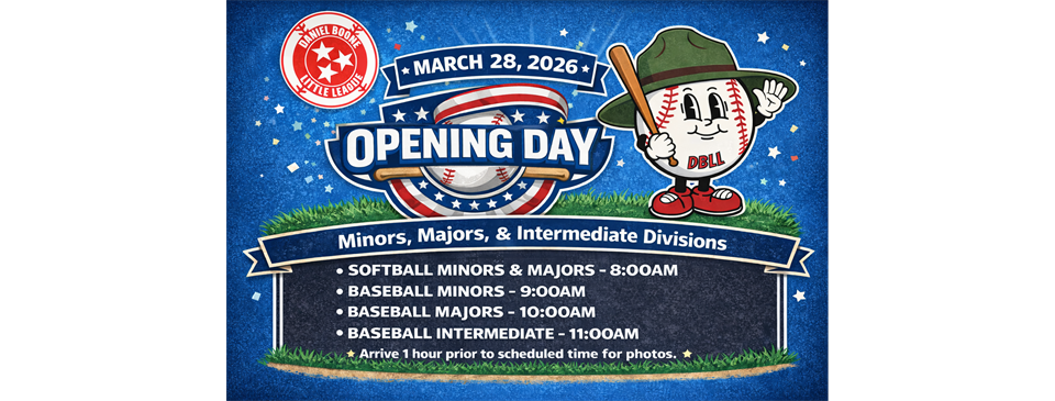 Daniel Boone Little League is a non-profit Little League organization located in Gray, Tennessee. Our league was founded in 1980 and is open to all kids within our boundaries in Washington and Sullivan Counties. Daniel Boone Little League offers Baseball and Softball in 4 divisions based on League Age: Tee-Ball (Ages 4-6), Minors/Coach Pitch (Ages 6-8), Majors/Kid Pitch (Ages 9-12), and Junior/Senior (Ages 12-16). Daniel Boone Little League is solely comprised of volunteers throughout the community and is completely self-funded.