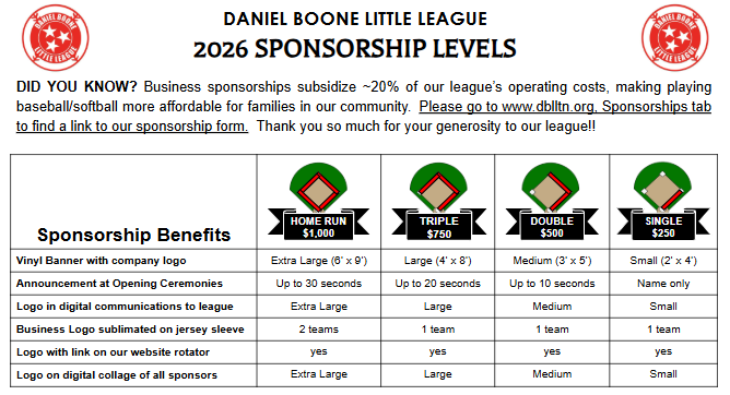 Thank you for your interest in supporting our league! Please click this link to register your sponsorship. Below are our sponsorship levels for 2026: